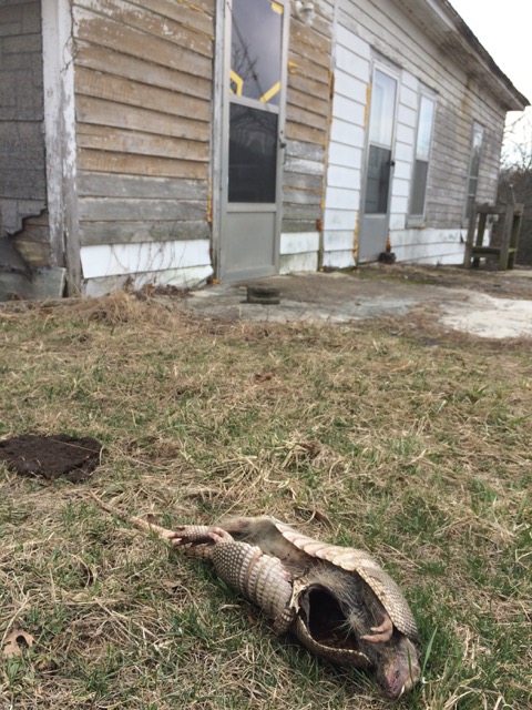 I cannot fail to mention the dead ‘dillo. It was right out in front of the house. Its carcass appeared not too old, not too fresh. It stank. I got it onto a shovel and flung its body into the pasture. I had never handled a ‘dillo before. They are capable of carrying the bacteria that in humans causes leprosy.