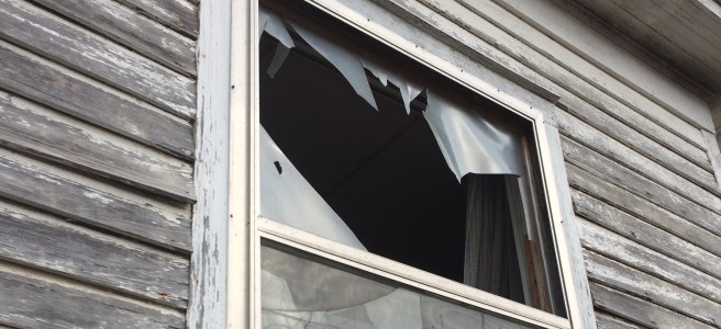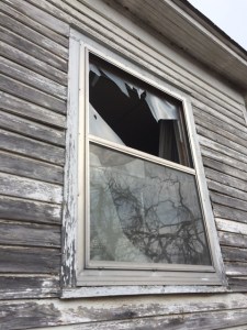 I could use a tape measure down here. A window in the back room is out, gone. The room is open to the world. I see no glass about the floor nor outside, below. Plastic sheeting must have been there before.