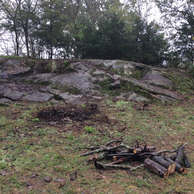 I cut on a fallen hickory Saturday morning around eleven. It was on the pasture side of the barbed-wire fence but in actuality it was quite close to the fire spot. From the fire spot you would climb the rock, get over or through the fence into the pasture, turn to the left and then walk about forty feet through weeds, shrubs and short, young trees. Patrick, Billy and for a moment Wilson helped me get the sawed logs down to the fire. Patrick stacked them down there in an aesthetic way. As we began to go through them we would stack them bit-by-bit on their end around the fire as we had done on Friday. I had cut the hickory pieces in a way to make them sort of stout and squatly, making them excellent perches for resting a pie-iron on. The logs circling the fire this way made the coals more accessible to the various, rotating crew of cooks—it allowed multiple cooking access points. The fire was still smoky but I’d chalk this up in part to the wetness of everything, rain at times falling on the fire as it smoked and burned.