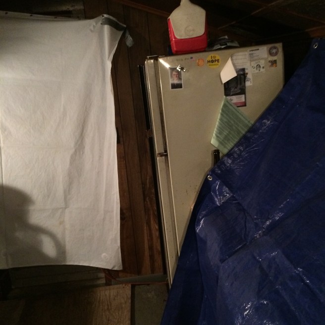 I take down the shower liner from the front door, sliding the coin magnet up and up along the metal cabinet until the liner falls free of it, into gravity, down. It is still dark.