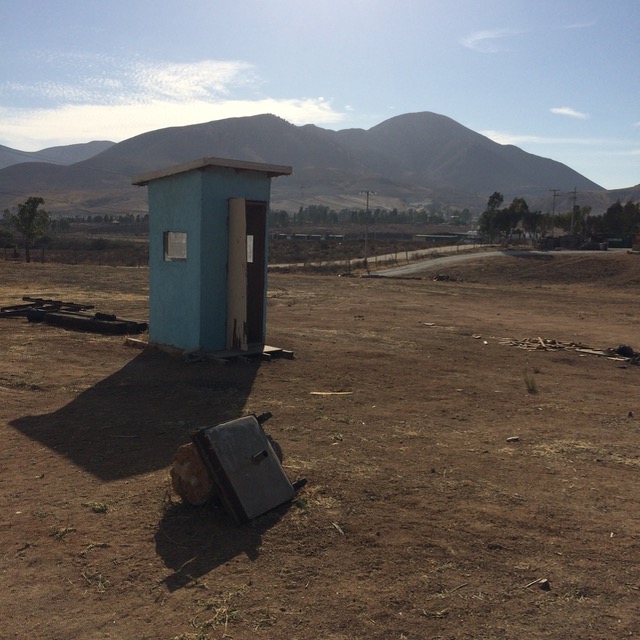 Still, there’s a lot of trash on the roadside. I wonder. Plastic, styrofoam. Turning right. Dirt road. A fledgling village, on a hillside. A lot of these houses look like Amor houses. Then there are a couple of rather grand, carefully constructed stone walls. With nice stone, not cinder block. Mike says he’s been here. This is where he worked on a house earlier this year. The road we were just on is the road to the new Tijuana dump.