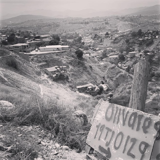 Tecate corridor, Highway 2. A stop light. Palm trees, what looks like an aspen. It’s dry. Prickly pear. Sushi restaurant. Soccer field. Bomberos Tijuana. Street food. Now an opening. Valleying. A father and son pushing their bikes up a hill.