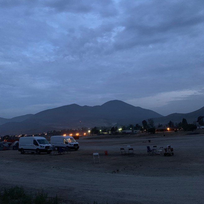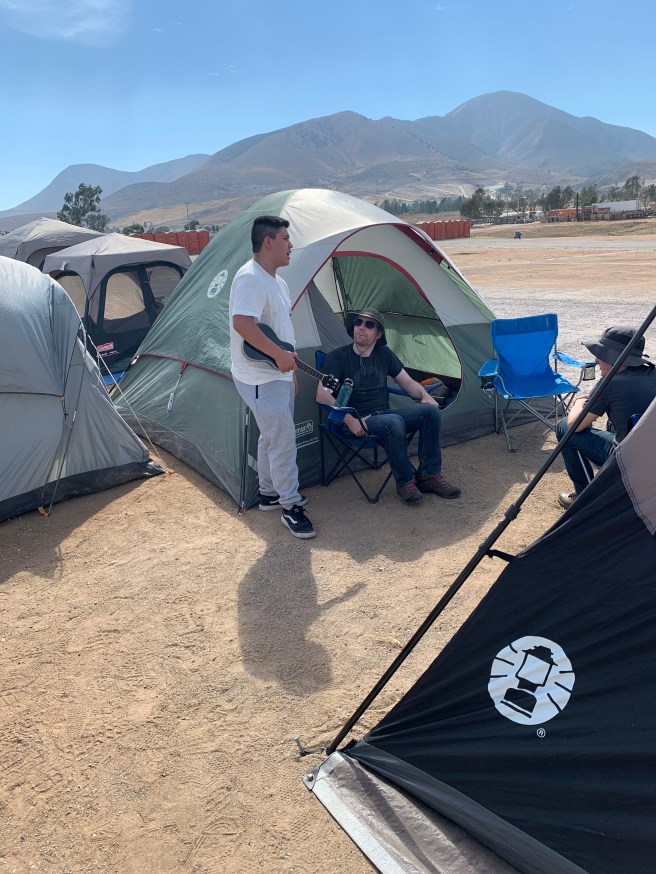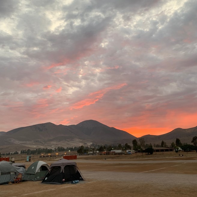 Well, I’m dry now, reasonably comfortable. My tent desk still has not arrived. Maybe I’ll have to join Prime after all. That reminds me of the motorcycle delivery guys we see passing us as we do our speed-bump, bad-pavement-crawl through Ojo de Agua nearing camp in the evening.