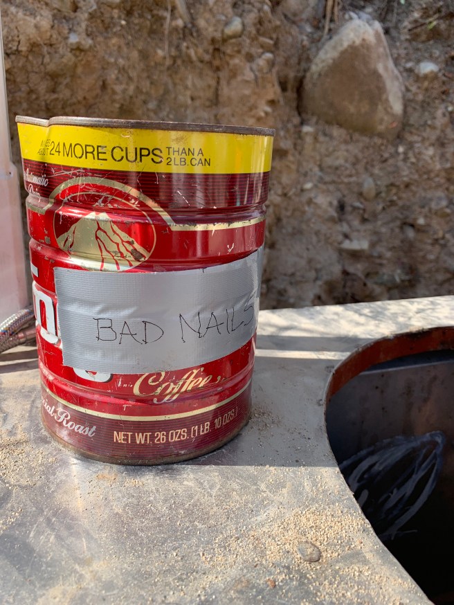 Bags of cement, a trough full of sand. Our water bottles. Nalgenes, a Kleen Kanteen, HydroFlasks. I gotta bring the Hydro next time. To stash my own ice. Next time? As if it is a done deal. Tijuana, love it or leave it? Here you can do both.