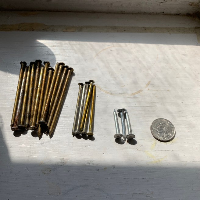 I needed to get on the other side of it. And did. It’s not that easy to sink them in the rafters. We use a chalked slap line but it’s fallible. Could we employ a stud finder up there? I think I did alright sinking mine. I was using my hammer to knock, to feel for a different sound.
