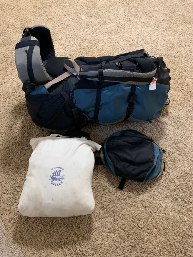 ° Bags within Bags. I brought all kinds of bags. Chiefly my large backpacking backpack which, when filled, was gargantuan and heavy. Next I had my canvas, zippered ‘PATMOS, GREECE’ bag. It says that in blue ink, and there’s a picture of a sailing ship, like what the argonauts sailed in. Then I had my fanny pack, which I hardly leave home without. I needed all of these and more. The PATMOS bag became my pillow, stuffed with clothes. I also carried many more bags, of various sizes, to keep me organized. They did help! Even within my fanny pack I kept a flannel bag that came with a pair of shoes I bought. I kept cash and pesos and my passport in it. More on bags later.