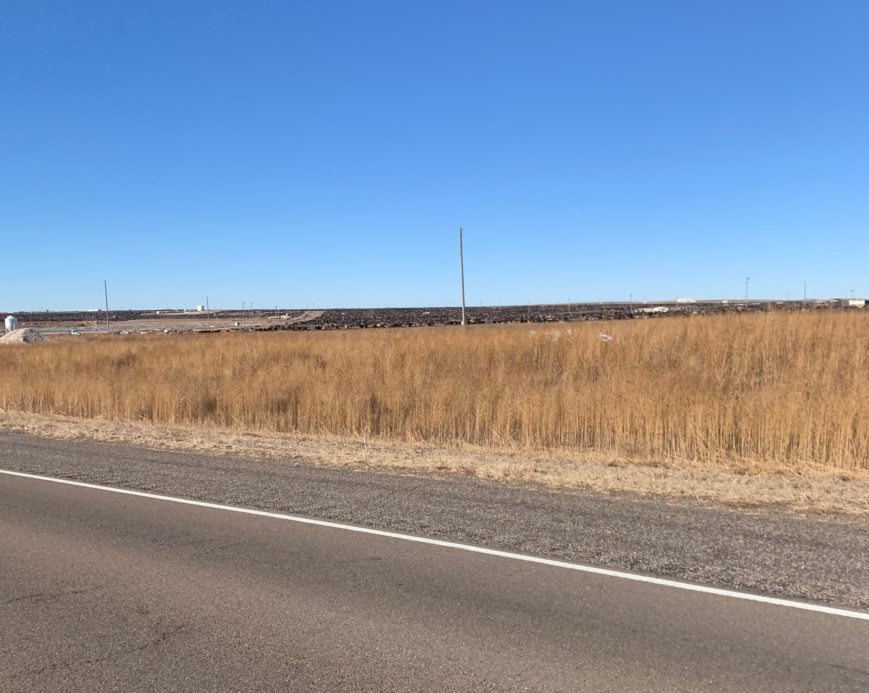 There are still ranches around but cornfields exist here, too. No more cholla cacti. Elevator town. ‘Texhoma Wheat Growers, Inc.’ is painted on one of several elevators. Blinking red. A couple of gas stations. There’s the Love’s we stopped at on the way out. Cotton field. Irrigation company storefront. Water Right is the name. Wind turbines. U.S. 54 east goes double-wide. I’m making my move, past a cattle truck. The wind!