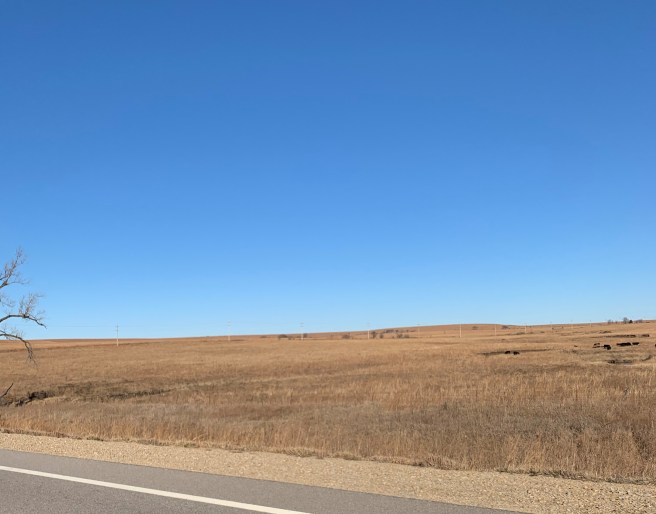 I’m east of Wichita, KS on U.S. Highway 54, where Butler County ends and Greenwood County begins. Hay, cow ponds, the cattle dark against the golden light of the field, dark against the blue of the sky, against the shapely hills.