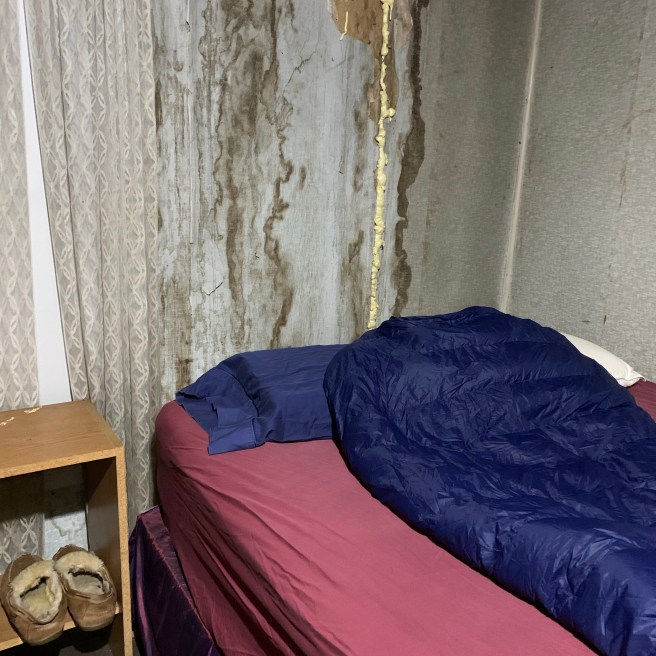 I don’t even know who brought this mattress down here. It’s three a.m. and it’s chilly here in one of the back bedrooms. British Broadcasting flows on the radio, to cut the early morning quiet. I sleep with the light on, as usual. Three layers, long johns, a beanie. But it’s warmed up considerably compared to a week ago.