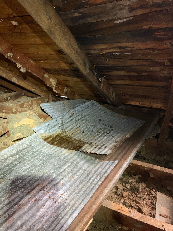 In the attic, there is a roof beneath the roof. Following the lead of someone who worked here before me, someone whom I never met, I place unwieldy sheets of corrugated metal, salvaged from scrap heaps, at a slight slant over rafters. Below is the ceiling of the house.