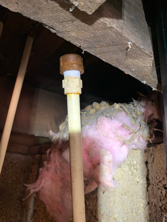 At Farm, there is always an answer. It’s just a matter of finding it. The hot water heater that a prior generation used to supply hot water to the house on weekend farming and hunting trips still sits in the pump room, rusted and brooding. Screwed onto the end of a pipe coming off of the hulking appliance I found a threaded metal cap. I unscrewed the toilet supply line where it comes down through the pump room ceiling and left that dangling. The metal cap was a perfect fit for the now-exposed piece of PVC previously connected to the toilet supply line. I opened the red knob to turn the water back on. The terminated line was dry. The house had water.