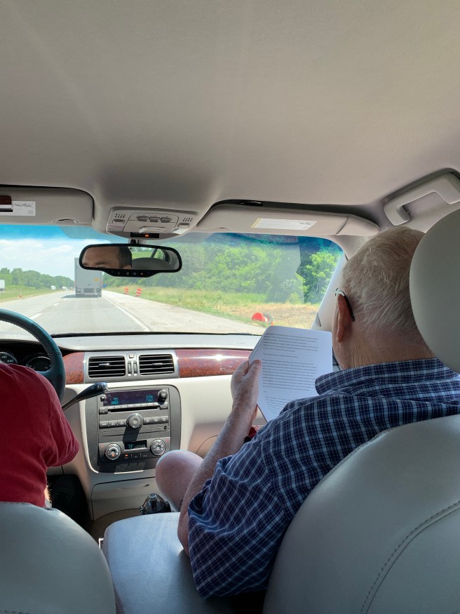 My brother is driving. I’m in the backseat at liberty to write. Dad, riding shotgun, shuffles through sheets of paper explaining stock valuations and physical therapy exercises.