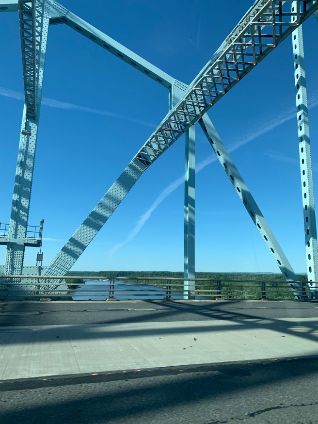Over the Westfield River. Earlier we tracked the Mohawk River as we continued east through New York, not yet to Albany. At times we passed over or nearby the Erie Canal. We saw an old, erstwhile lock of the Canal right beside the highway, now completely dry, just dirt, grass, and interstate.