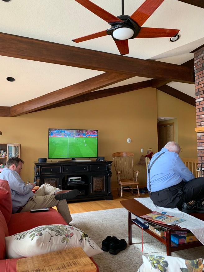 Inside the sluggish sliding door separating the back porch from Elsie’s great room, we got my dad over to the comfy chair facing Elsie’s TV, on which the final round of the U.S. Open was unfolding. He was tuckered out by the sun and relieved to be sitting down again. He never made it back over to The Stand. Anna and John’s kids, Judy and John, went over with his phone and took a bunch of photos and some video for him.