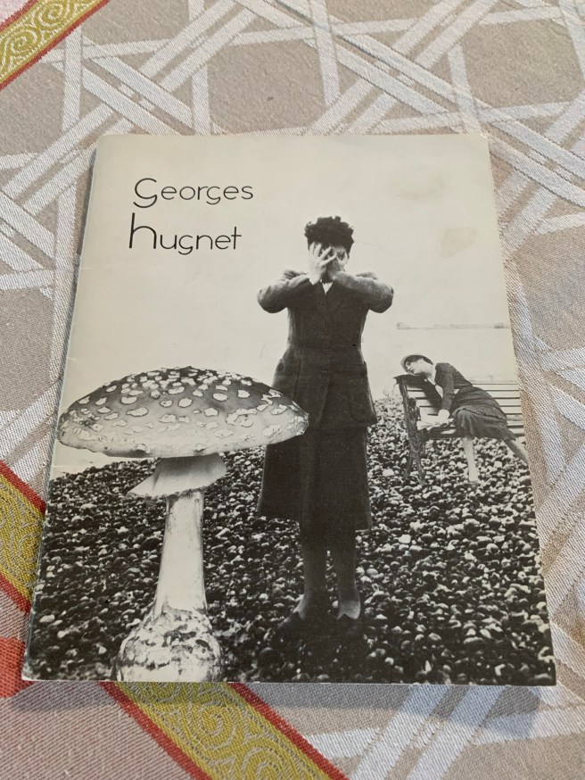 I started pulling chapbooks at random, which one can rarely do. Chapbooks are almost pamphlets. They have no spine; they aren’t thick enough. But they’re eclectic, strange, and a lot of fun. I pulled one by Georges Hugnet, which has a wild black and white surrealist cover consisting of several photos photoshopped together in the age before Photoshop existed. There’s a large amanita mushroom upfront, with a stony beach scene in the background, a woman in misery holding her hands over her face, and someone behind her passed out on a bench.