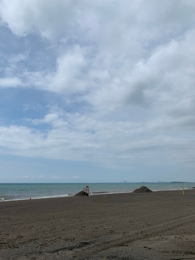 We continued down route 5 and pulled into a park along the beach. At first we didn’t see a bathroom but down toward the water I saw a port-a-potty, which we ended up using. It wasn’t a bad place to stop. I got out and looked at the water for a while. Took a photo. The lake looked like an ocean, with white-capped swells and water as far as I could see. There was someone fishing and another person out windsurfing on the chop. I saw the windsurfer fall but get back up again without too much trouble. Further up the coast, to the north, was the skyline of Buffalo, a few windmills spinning in the sky between the beach and the gray outline of the city in the distance.