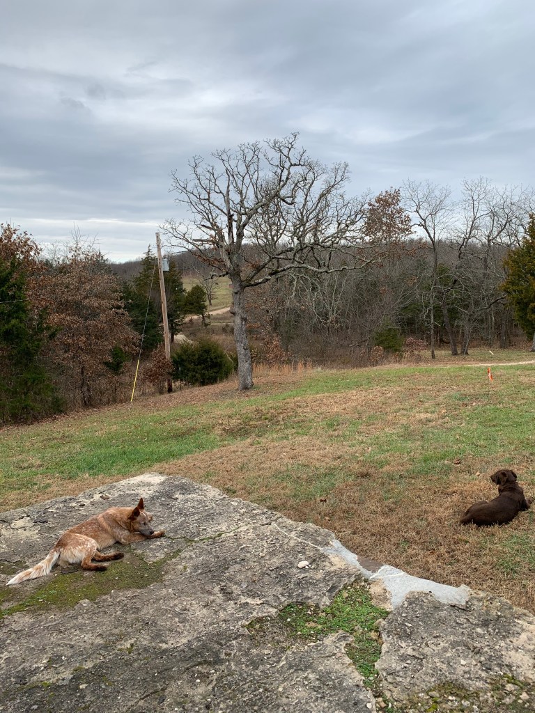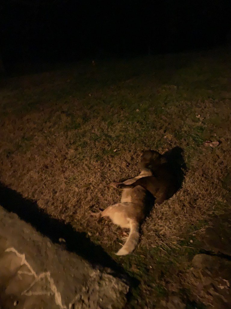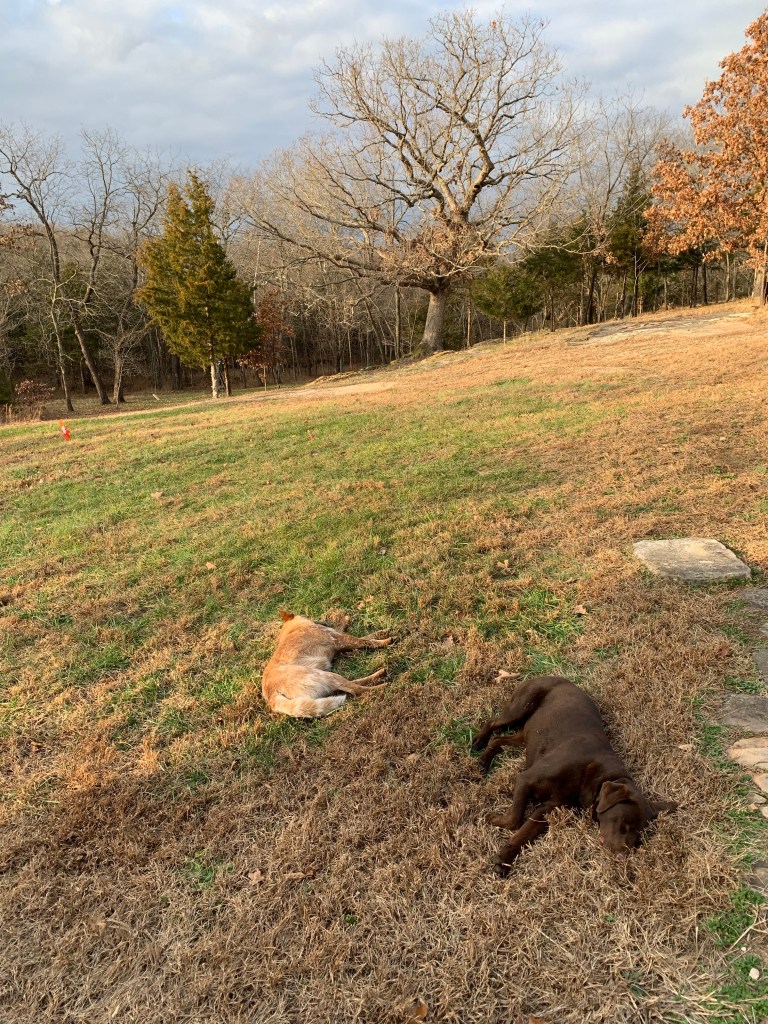 It was comforting to have them out front during the night. The chocolate lab, a female, laid on the grass, visible straight out through the window pane of the kitchen door. I would be doing something in the kitchen, with the door closed, and I’d take my eyes off of them. Then I’d look back out through the glare on the plexiglass and when my eyes adjusted I could see her brown form slightly curled up out there, happily asleep.