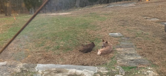 It was comforting to have them out front during the night. The chocolate lab, a female, laid on the grass, visible straight out through the window pane of the kitchen door. I would be doing something in the kitchen, with the door closed, and I’d take my eyes off of them. Then I’d look back out through the glare on the plexiglass and when my eyes adjusted I could see her brown form slightly curled up out there, happily asleep.