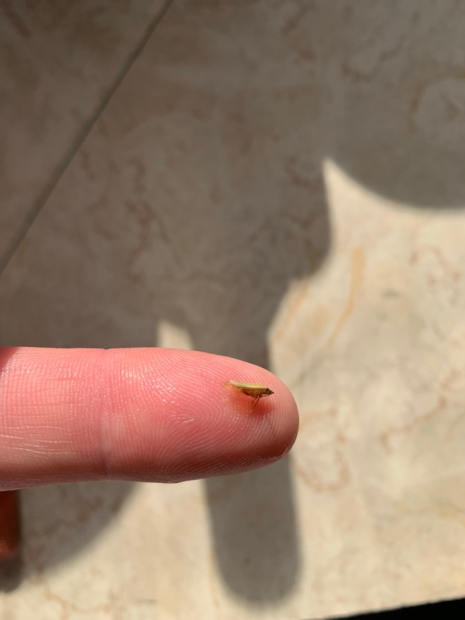 Maybe the bugs that landed on me are planthoppers? Maybe a mayfly? Maybe a midge. They’re not aphids. More likely one of the hoppers. Leafhoppers. I’m going through the field guide on my phone, entry by entry. They’re leafhoppers. They look like tiny cicadas.