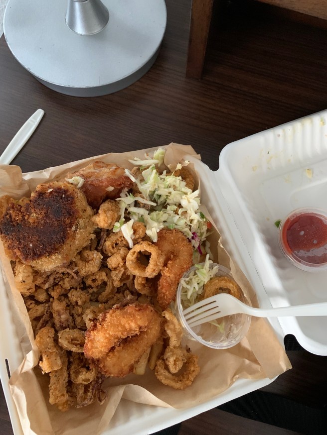 A man makes his way into the parking lot from across the street. He is wearing a backpack that is designed to hold fishing poles. In his other hand he holds what looks like a heavy bag of ice. I know what he’s eating tonight.