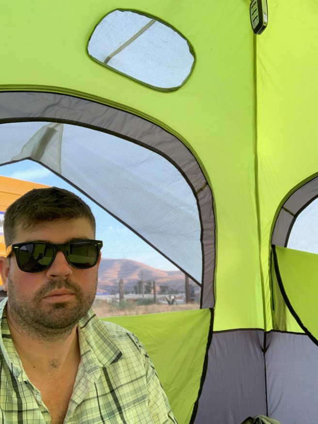 In Mexico, at camp, east of Tijuana. It’s hot. I looked at forecasts for Tijuana before I left St Louis but I realize now that those forecasts were misleading. It’s more like half Tijuana forecast, half Tecate forecast. Tijuana’s just off the ocean but Tecate is in the desert.