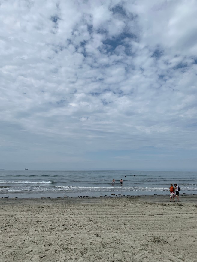 I looked for a mask in my fanny pack but I didn’t have one in there. I had a couple buried somewhere in my bloated backpack but there was no way I was going to dig them out. So I kept my focus on the open window. The temperature was low seventies, perfect. The clouds had all been burned off or swept away. It had been overcast when a handful of us braved the cool water and played in the ocean waves along Coronado earlier in the day.