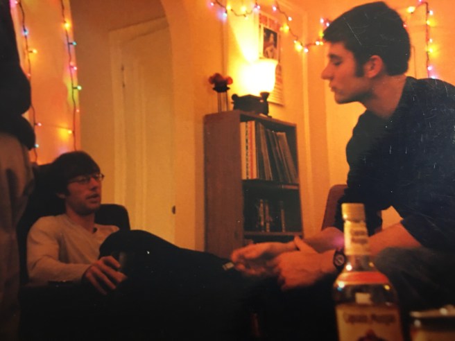 Then I sent a text to Adam, an old mutual friend of both Phil and me. Phil hooked us up. Adam and I had both signed up for an English criticism class with a woman named Lisa Eck. This was an oddball English lit/criticism class that exposed me to a bunch of poetry I ended up liking. I was just starting to smoke marijuana and I was writing some crazy (good) essays for this class and at least one other. Adam and I had almost nothing to do with one another until late in the semester. At some point I realized that the guy from my English crit class was a friend of Phil’s; they were in the same fraternity.