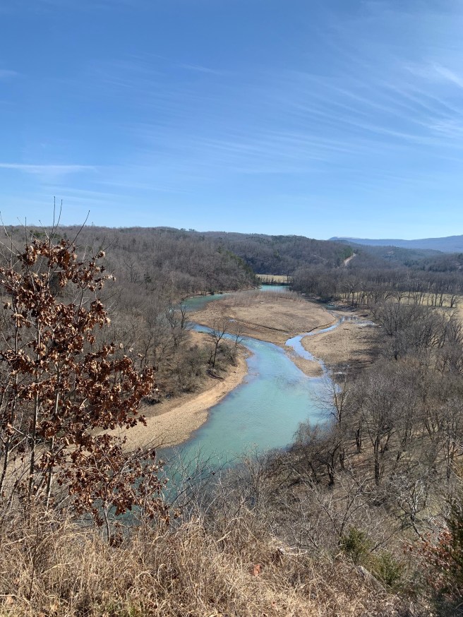 This is Buffalo country. Crossed over the Buffalo River. I’ve heard about it. It sure is pretty. From this bluff overhanging the chalky blue of its stream. Three hundred miles I’ve come and I’ve seen a river worth seeing. Five hours on the road without a stop. But now I must pull off and take a photo.