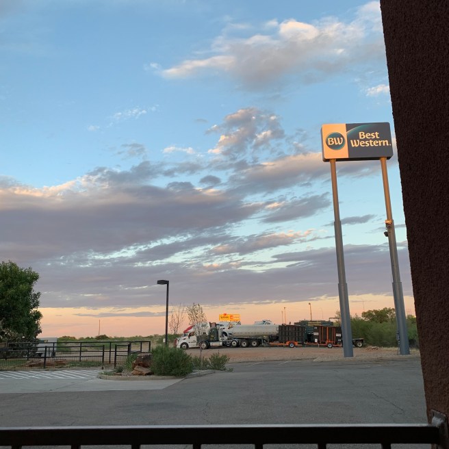 The guy I chatted up was wearing a backpack, gym shorts, and flip flops. He was white; we spoke English. He was from Tucson, the very destination of our trip. He told me the crew puts down road pavement. Asphalt, then sealant. They had all sorts of specialized trucks and equipment on trailers parked not just up and down the motel parking lot but overflowing onto a dirt and gravel lot reaching beyond the motel proper. Over the road truckers use the same lot to park their semi-trailers.