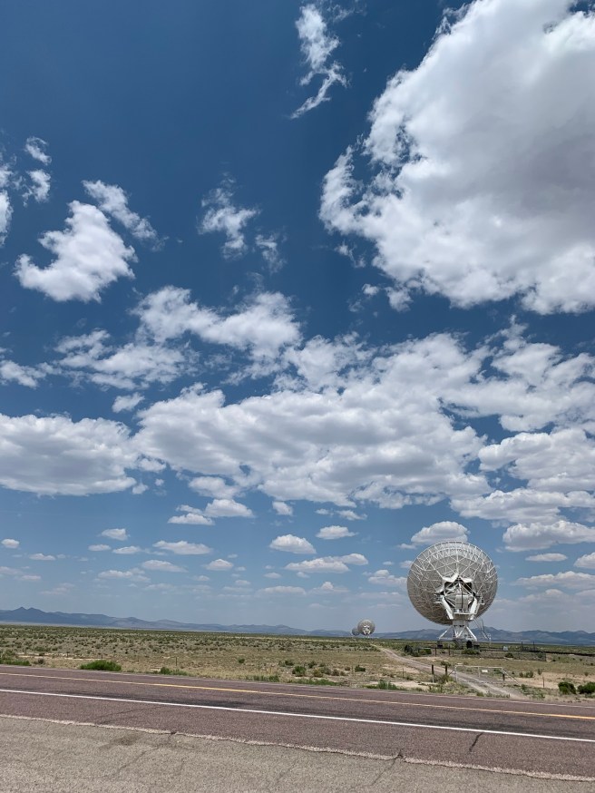 New Mexico. Wide open with mountains always somewhere in the distance. The land scrubby, with vast ranches, and cattle dotting the landscape, a sudden congregation of trees. A small town, or the relic of one. Encino. A rusted sign for a long-defunct motel. B picks the speed back up and the town is once again just a place in someone’s rearview mirror. We turn off onto NM 60, west to Mountainair.
