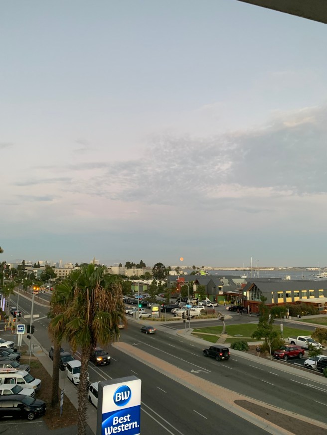 It’s 4:25 Pacific time, San Diego time. Sunday morning and a good one. Some hip discomfort, right hip. I probably strained or irritated something hiking here to the hotel from the airport yesterday. Heavy pack, 45-minute walk west to the Point Loma district of town. I didn’t feel strained or physically stressed while making the trek, but that’s all I can think of. I feel it while walking. And I walked a lot yesterday.