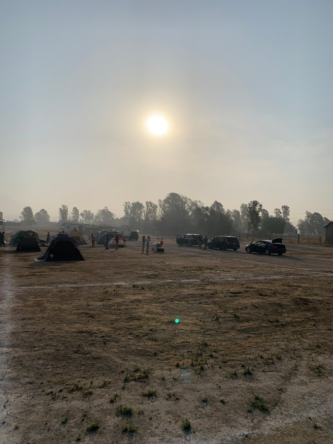 A large fire starts up. I see it straight out my open tent door, whatever direction that is. Northwest? It was also burning there last night. The fires, the burning, the smoke. It’s getting worse here. This camp is otherwise in a good spot, in land the government deeded Amor, bolstered on two sides by government-owned gas pipeline infrastructure. La policía seem to have a substation in the lot right next to us.