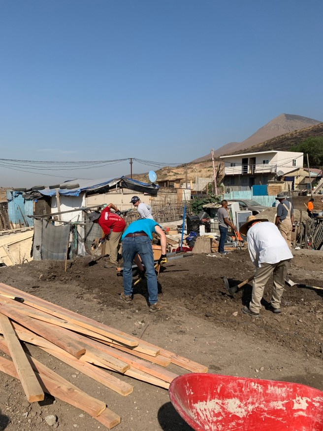 The scarcity of space and the unevenness of the lot slowed us down. It was hours of moving dirt around to get a 22 foot by 22 foot section of ground level enough for us to begin mixing and pouring concrete on top of it. By that time, our worksite leaders and our Amor rep David agreed that it would be wise to pour just one half of the concrete pad, leave the other half for tomorrow. So that is what we did, deflating as it might be.