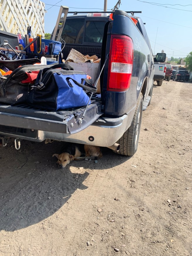 I am sitting up on my cot resting, looking out at whatever is going on. Watching the sun continue to fall, mercifully, behind the mountain. Cooper, one of Mike Mayer’s grandsons, reveals a trick for locking Big Blue, the big Ford pickup Frank drives down from Altadena, all sorts of wheelbarrows and tools loaded up in the back. Mike has done this trip something like 26 times. Frank is one behind him.