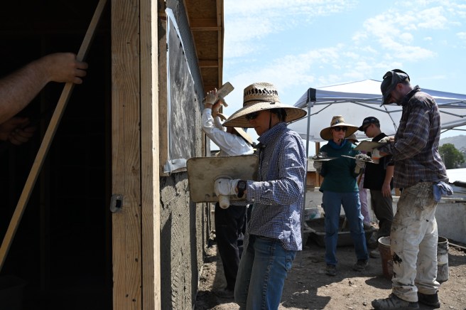 I had an early hawk of stucco and started smearing stucco on the eastern wall. Then Jen Dawson sort of ran me out of there. I think she wanted that wall pretty much to herself, which I later realized she was more than capable of handling. How was I supposed to know? She had done this trip at least a few times before, before my time, and she knew what she was doing with stucco. She had a different method. She wanted a whole bucket filled up. Then she troweled it all on.