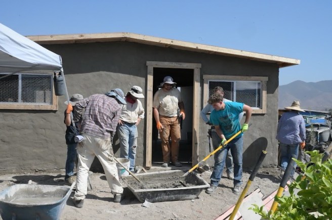The first coat went on incredibly fast. I found that I was most of use mixing up batches of stucco until only the higher parts of the walls were left to be covered. Then I stopped mixing and started smearing stucco up high. Tim, Thomas, and Cynthia had hawks of new mud ready anytime I turned around. It was simply the cleanest and quickest application of stucco in the five years I’ve done the trip.