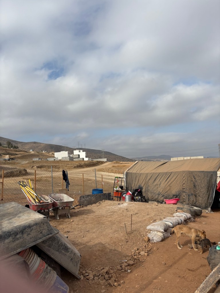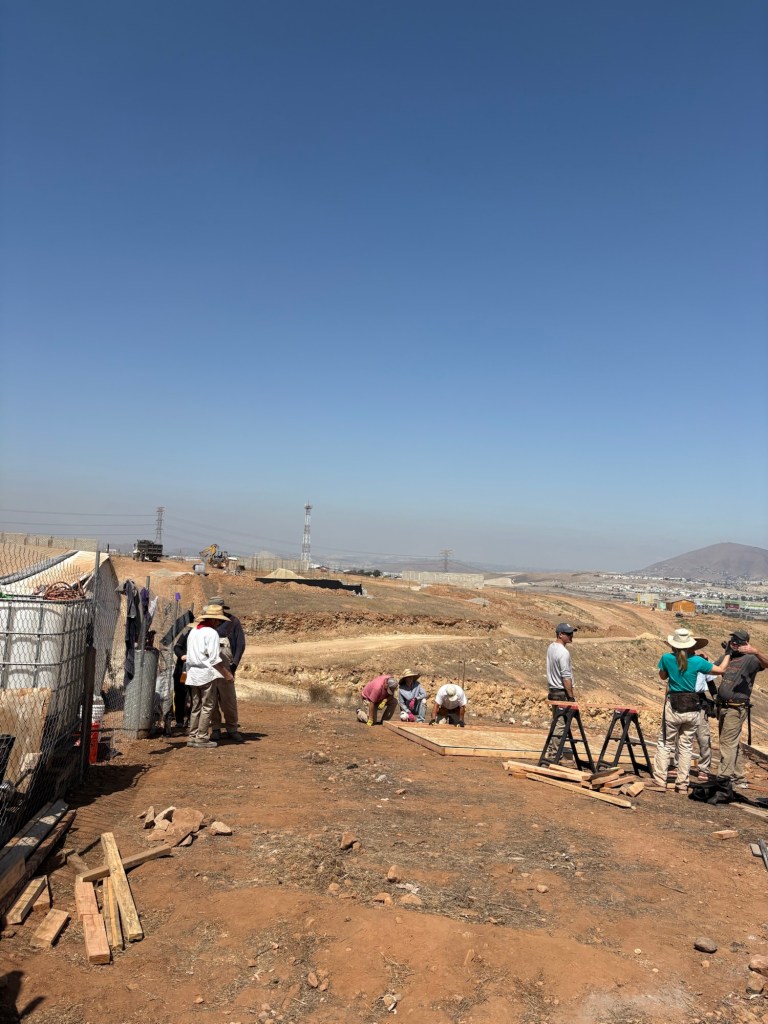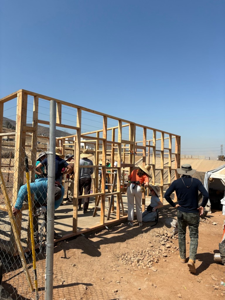 It is Tuesday, day two of the construction. We ended early today. Pad is down, house frame is up, plywood roof is on. Chicken wire, roof shingle paper, and first coat of stucco planned tomorrow.