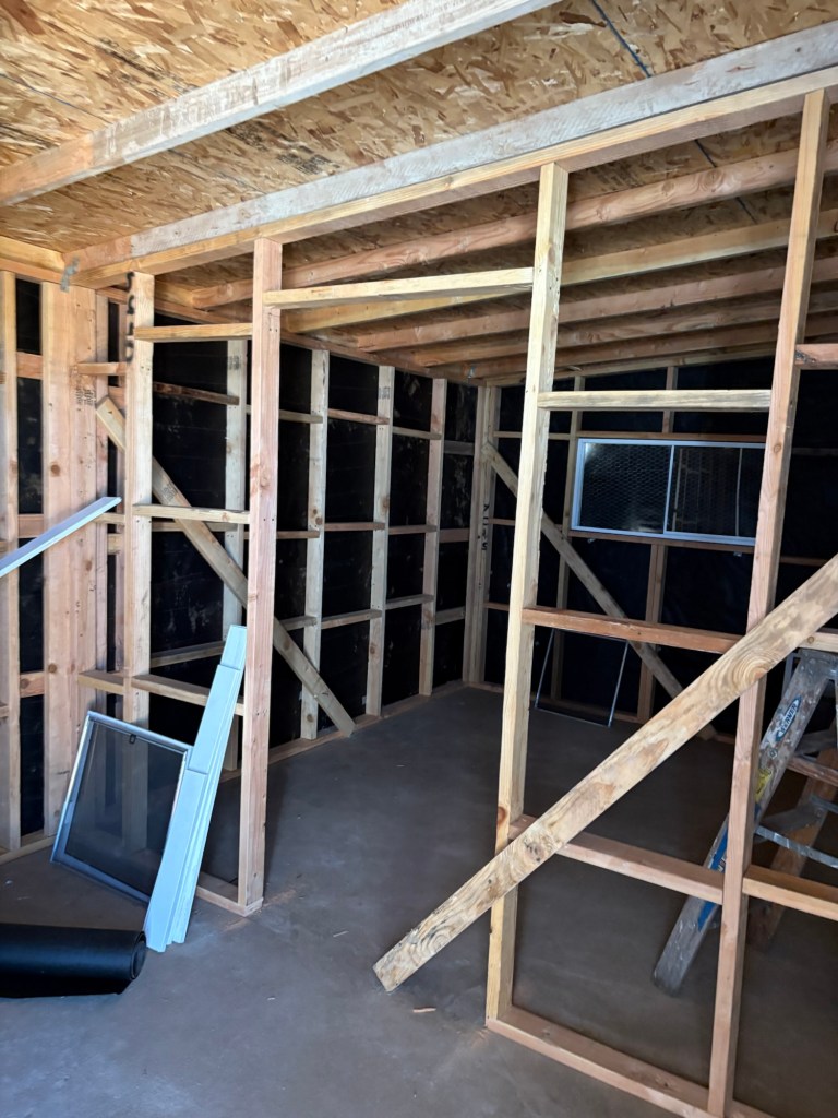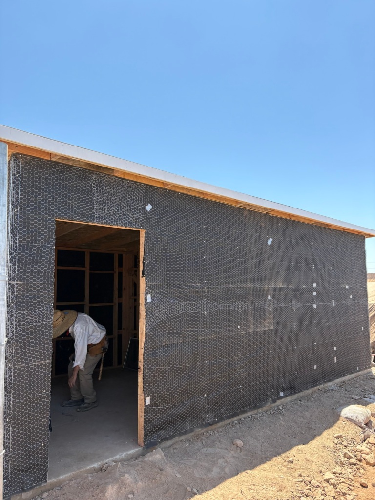 This is the inside of the house before we stuccoed the outside and cut the tar paper off the windows. Homeowners Heidi and Jose Luiz asked that we not cut the chicken wire off of the windows, seeing it as an added layer of security.