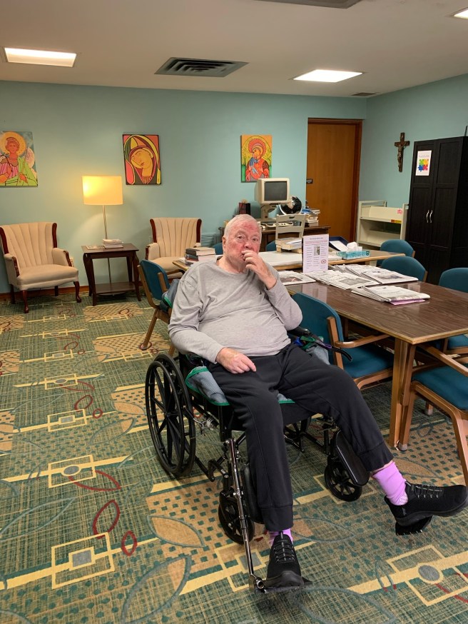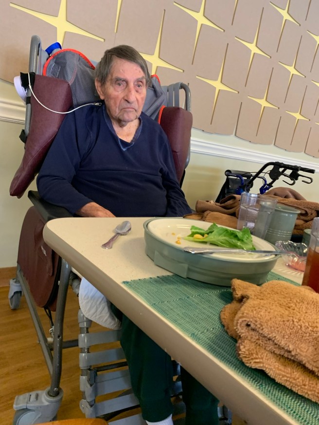 He’s taking a shower. Or getting a bath. Per Karin. She saw me coming and intercepted. Not just to tell me about the shower but to tell me that, “He’s more confused than usual today.” She wanted to let me know so I wasn’t blindsided.