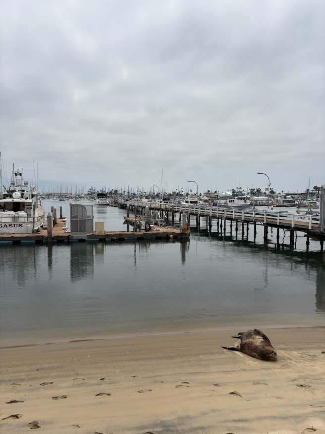 A sea lion is bawling, howling, yelping, bellowing not far from here, on a little beachy area along the harbor walkway. If someone had not asked someone else—”Did you see the sea lion?” “Where?” “Right down there on the beach.”—I would not have known what was making the sound. Now someone is suggesting the sea lion is injured. “It’s got, like, a bunch of bite marks.”