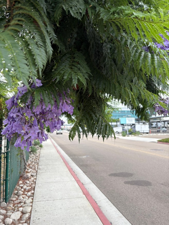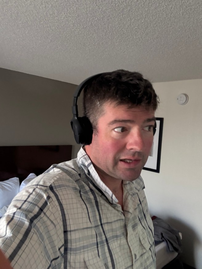 This begins with me finding a pair of JBL over-the-ear headphones. Left behind, it appears, by someone boarding an earlier flight. I can charge them with the cords I brought, though they appear to be fully charged. I have other headphones with me. An older, wired pair of noise-canceling Bose earbuds, which I also found, walking one morning. The Bose headphones are on their last leg. Their sound is excellent but they connect by way of an aux plug, which is nearly obsolete anymore. I have a workaround whereby I plug the aux jack into a Bluetooth device and stream the music from my phone but now I don’t even need to bother with that. I also have a pair of AirPods, which were my plan B if the Bose failed. At home (outside St. Louis, MO) I have a pair of over-the-ear headphones. They are probably nicer than these JBL but they’re also bulkier, like a big clunky pair of earmuffs, which is why I didn’t bring them. These JBL pack up easier; there is just enough room in my fanny pack for them so I will keep them. And I will wear them on the one hour and twenty minute flight to San Diego.