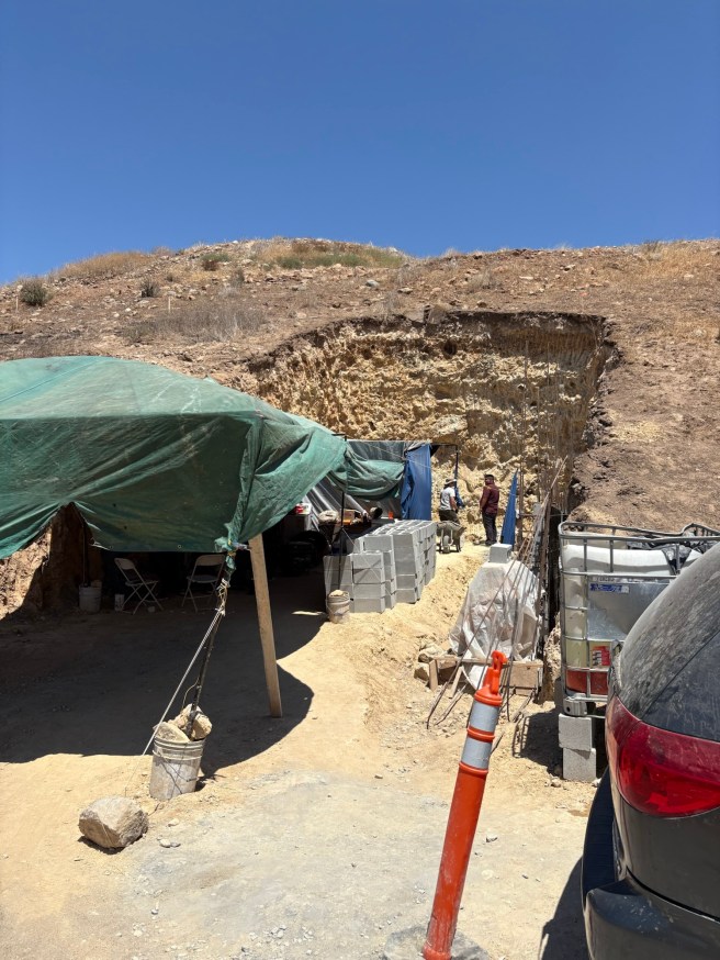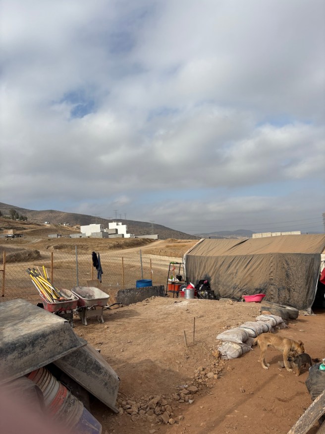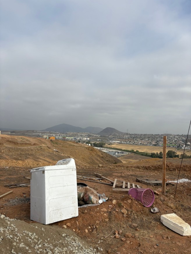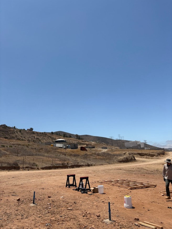 The drive to the site yesterday was memorable. Through El Niño and Ojo de Agua, where we saw two houses we built, one last year and one the year before that. Bustling, this city. The Ojo de Agua road heads south and eventually makes an intersection with Highway 2. Busy intersection. There is a traffic light but the light seemed only to heighten the chaos. I was making a right on a green. A semi coming through from across the freeway must have had a green yield for its left-hand turn but this truck was bound and determined to make its left, oncoming traffic be darned. It was a free-for-all. We headed west/southwest on the highway for perhaps ten miles before preparing to take a left against/across the traffic coming the other way on what, at that spot, was a three-lane highway, with some cars traveling at about 50 mph. As is custom in Tijuana, some of the cars coming the opposite way see that traffic needs to turn and they stop so the turning traffic can get across the road. Two out of three oncoming lanes had vehicles pausing to let me turn, but one lane was still thrumming through at full speed. So the cars that wait out of courtesy get a hat tip from me but unless all of the traffic is going to wait, the partial courtesy is pointless. I waited a bit until I knew I could make it across regardless of whether oncoming traffic was going to stop or not. I floored it across the three lanes only to have to stop pretty quickly because there were all kinds of semis and other trucks stacked up at the mouth of the road we were turning onto, the surface of which was dirt and rough. There are basically no rules for driving in Tijuana except one: don’t screw up. Luckily, I was not the only person uncomfortable with the idea of making this turn again, which we didn’t. Our Amor rep Davíd took us to the site by way of another route the rest of the week—a route which was longer but also new, to me, and quite picturesque in the way Tijuana can be, reminiscent of an old dusty town in Italy I might visit some day next decade.