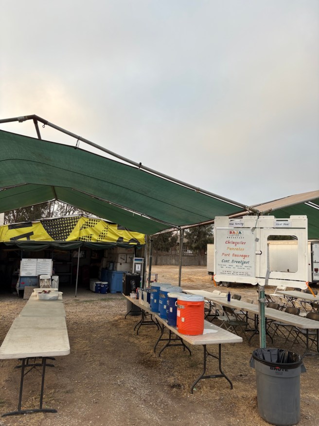 5:10. Trying to figure out the rainfall totals from overnight, back east in the Midwest. It’s still dark. Eugenio is already getting breakfast, coffee, and the lunch spread underway in the big tent.