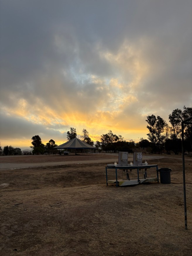 I’m hurting a little bit this morning. Left my water and folder out near the campfire last night. I came back to the tent after crashing out following the Rock Paper Scissors tournament. I was dozing when Sarah brought both the Hydroflask and the green worship folder by; left it outside my tent. There was music again last night, from outside camp somewhere. Apparently Sunday night/Monday morning’s music kept a lot of my fellow campers awake. Someone describing it as “disco” music said it was going strong until 2:30. It was a Mexican holiday on Sunday, and the music was attributed to a small pink house across the road inhabited by La Policía. I am surprised I was able to sleep through it but I was extra sleepy after the howling beast in San Diego robbed me of half of the sleep I should have gotten there.