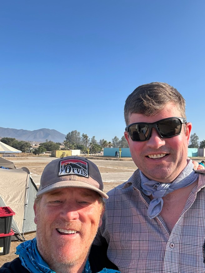 Things I’d write about if I had more time. Having to take most of our gear out of the box truck as we crossed into Mexico. Jim sweating as he kept going back into the truck to grab an item to hand down to one of us, all of our gear out on the sidewalk while Mexican customs barely even opened a lid to look inside this or that container, all a show. The sausage biscuit and banana I had for lunch, looking for a small bag of pretzels for my secret pal in Von’s, checking to see what tools I could buy at Walmart, which were none because they were all locked up, filling up the van with gas while others were eating, short on time in Home Depot where I bought a saw and some gloves before hurrying back out to meet the Amor reps to do the drivers’ meeting. Having Dan’s tent, Jim’s cot, and Randy’s mat, my thanks again to Cheryl and to Jim for hooking me up with the camping gear I am lucky to have for another year. A full Mayer contingent, Mike with a son, a daughter, a son-in-law, and four grandchildren, pretty special. Getting a decent vehicle from the Car Rental Help Center. Our van is nice. I’m driving the seven-passenger Toyota Sienna. Jason is driving a 15-passenger Transit that isn’t in great shape. Reportedly, it does not put out much A/C. Gotta go eat. 18:06.