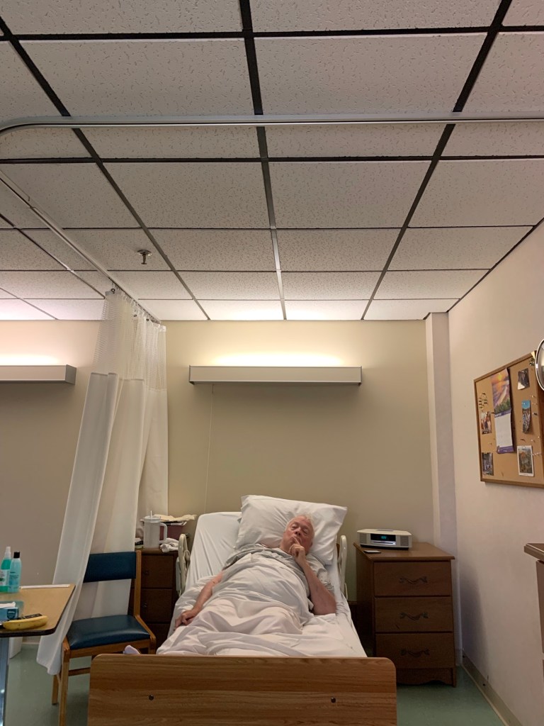 I needed the light from outside. If there is anything I need when I am in his room, it’s a floor lamp. There isn’t any overhead lighting. Until the Covid outbreak began, I hadn’t really spent much time in this room. We would always be outside, or in the reading room, or in the Bird Room. Or wheeling around the Shrine/Benedictine grounds whenever and wherever we could.
