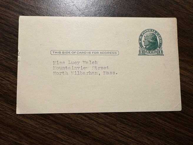 It’s addressed to a Miss Lucy Welch, Mountainview Street, Wilbraham, Mass.