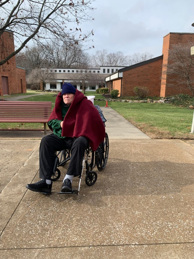 I talked to his CNA, then I talked to Nurse Crystal. She said the sore he had was healed up. She asked him some questions, which he couldn’t or didn’t answer. We couldn’t really figure it out but something has him uncomfortable. Also, the right pedal on his wheelchair still won’t click into place, probably never will. Are there other pedals, I asked. The request was already in.